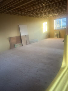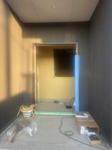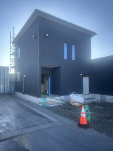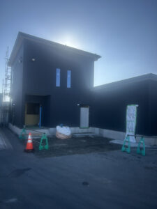前回ご紹介したときは木の骨組みだけでしたが、今回訪れるとネイビーのスタイリッシュな外壁が張られ、すっかり建物らしい姿に。内部も石膏ボードが貼られ、お部屋の形が見えてきています。玄関ポーチも仕上げが進んでいて、完成がどんどん近づいています😊